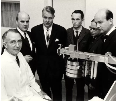 第一次血管通路手術(shù)發(fā)生在1948年,尼爾斯Nils Alwall(1904-1985)(左一)和萊納特?奧斯特格林(Lennart ?stergren)(左四),在瑞典名校隆德大學(xué)對轉(zhuǎn)鼓人工腎進行了改進,使其能通過負壓進行超濾。但由于各種并發(fā)癥,1949年被迫停止了該類手術(shù)。