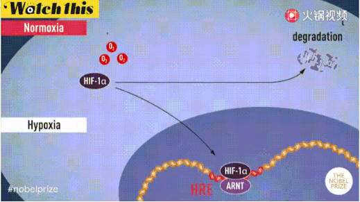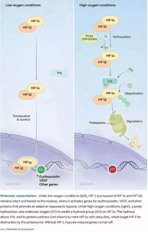 獲獎者之一的Semenza教授在培育的肝細胞中發(fā)現(xiàn)了一種蛋白質(zhì)復合物以一種氧依賴性的方法與已判定出的 DNA 片段結(jié)合,開啟某些基因的表達。他稱這種復合物為缺氧誘導因子(HIF),是一個轉(zhuǎn)錄因子。HIF蛋白在低氧氣濃度時會積累,使細胞開啟應對低氧環(huán)境的系列基因表達;而在氧氣濃度高的時候,HIF會發(fā)生羥基化,然后該因子被泛素蛋白酶體系統(tǒng)降解。如此,細胞可以通過感知氧氣并對HIF的調(diào)節(jié),實現(xiàn)對細胞中基因表達的控制,來應對機體氧含量的變化。經(jīng)研究發(fā)現(xiàn) HIF 由兩種不同的 DNA 結(jié)合蛋白組成(即所謂的轉(zhuǎn)錄因子,現(xiàn)在稱為 HIF-1α和 ARNT)。