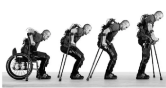 2010年,伯克利仿生研究所研制出的一種由電池提供動(dòng)力的機(jī)械骨骼系統(tǒng)“eLEGS“。這是世界上第一款不使用繩或鏈達(dá)到自然行走目標(biāo)的外骨骼,使用者通過手臂姿勢(shì)控制,向前移動(dòng)右拐杖,則左腿隨之向前移動(dòng),幫助截癱患者擺脫輪椅以自然步態(tài)行走。