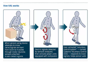 在這部科幻小說的啟發(fā)下,美國(guó)和日本在1960年后分別開啟了機(jī)械外骨骼的研究。美國(guó)由軍方主導(dǎo)研發(fā),日本則直接從外骨骼的商業(yè)用途入手,關(guān)注幫助殘疾人和老年人進(jìn)行日常生活和生活(散步、爬樓梯、負(fù)載等)。