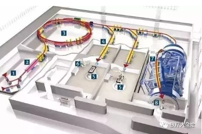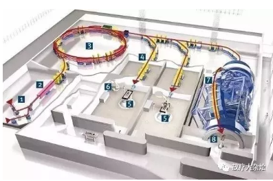 3. 同步加速器:六個(gè)60°磁鐵將離子束彎曲成圓形路徑。在大約一百萬個(gè)軌道中,離子被加速到高達(dá)75%的光速。