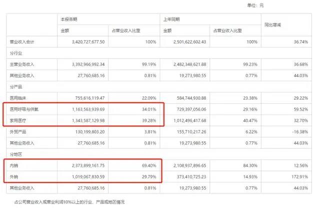 根據(jù)半年報,公司產(chǎn)品主要集中在醫(yī)用呼吸與供氧、家用醫(yī)療等領域,這兩項產(chǎn)品占比超過7成,且業(yè)務主要在境內(nèi)進行。所以真正能夠決定公司未來常態(tài)化業(yè)績表現(xiàn)的,不是外貿(mào)產(chǎn)品,也不是海外訂單。