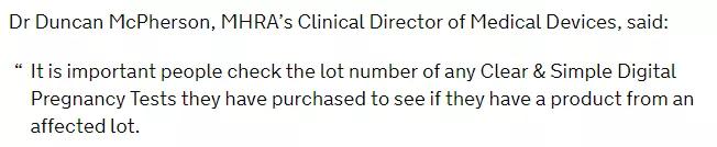 譯:MHRA醫(yī)療器械的臨床主任鄧肯·麥克弗森博士說:人們要重點檢查他們購買的任何清晰和簡單的數(shù)字妊娠測試的批號,看看他們是否有來自受影響批號的產(chǎn)品。