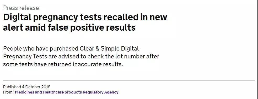據(jù)BBC、《衛(wèi)報》、美國CNN等多家媒體報道,英國驗孕棒品牌Clear&Simple的一批已售出的電子驗孕棒中,至少有58000名英國顧客的驗孕結(jié)果可能出現(xiàn)“假陽性”,而這其中的大部分的女性很有可能根本沒有懷孕。這一數(shù)字在隨后的英國《電訊報》的報道中增加至60000人。