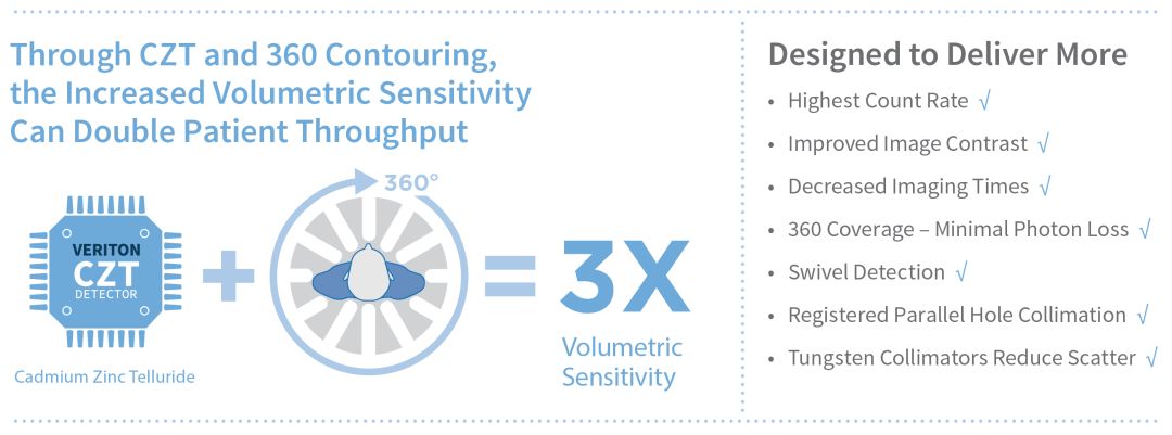 Spectrum Dynamics Veriton SPECT-CT 憑借360度探測器覆蓋范圍和獨(dú)特的接近傳感器,與當(dāng)前技術(shù)相比,其體積靈敏度提高了3倍。