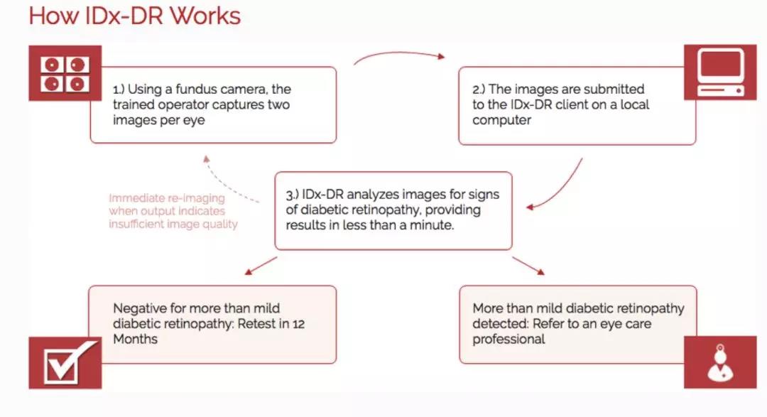 與預約真人醫(yī)生相比,IDx-DR 真的是太方便簡單了,只需要護士或者醫(yī)生通過使用特殊的視網膜照相機拍下患者的視網膜照片,隨后按照 IDx-DR 軟件的指示上傳圖像,并確定圖像的質量是否足夠獲得分析結果。如果圖像合格,軟件將自動分析(無須專業(yè)醫(yī)生參與)患者是否患有糖尿病性視網膜病變,并將根據結果診斷并決策后續(xù)治療。