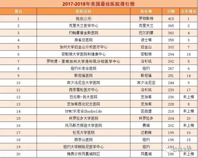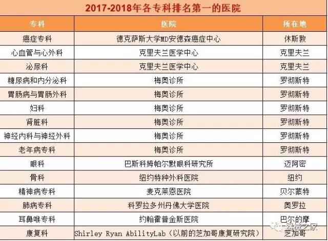 在醫(yī)療界梅奧診所就是傳說中的麥加,世界頂尖的醫(yī)療機構(gòu)。2017年8月8日,《美國新聞與世界報道》公布了2017-2018美國最佳醫(yī)院排行榜,梅奧診所以415分的總分再次榮登榜首,并在糖尿病和內(nèi)分泌??啤⑽改c科、婦科、腎臟科、神經(jīng)專科和老年病學六個??浦信琶谝?。
