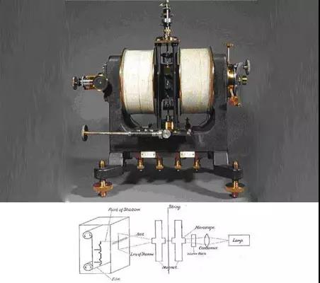 因為毛細管靜電計的毛細血管不可能做的太細,他無法測到更精確的電流,愛因托芬改進了這個裝置,他利用通電的導體可以產(chǎn)生磁場的安培右手定律發(fā)明了----磁電式儀表。愛因托芬把提高靈敏度的任務完全交給超大的電磁鐵,而動圈以匝數(shù)最少,質(zhì)量最輕為目標。最終的結(jié)果是1895年推出的弦線式電流計---看清楚還不是心電圖機。