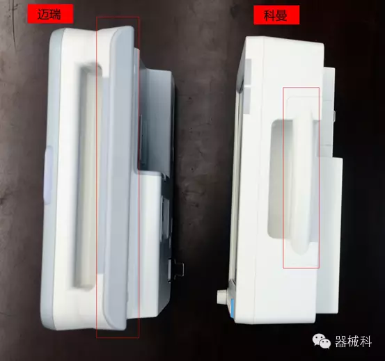 科曼與邁瑞因機(jī)身尺寸上有區(qū)別,所以手柄方面,科曼明顯比邁瑞要小。科曼采用大弧度,呈現(xiàn)橢圓截面的設(shè)計(jì);邁瑞采用方形小圓角,折疊活動式的提手,塑膠包裹。手柄嬌小,不利于握持,但重心集中,更穩(wěn)定;手柄碩大,活動范圍廣,卻也容易晃動。