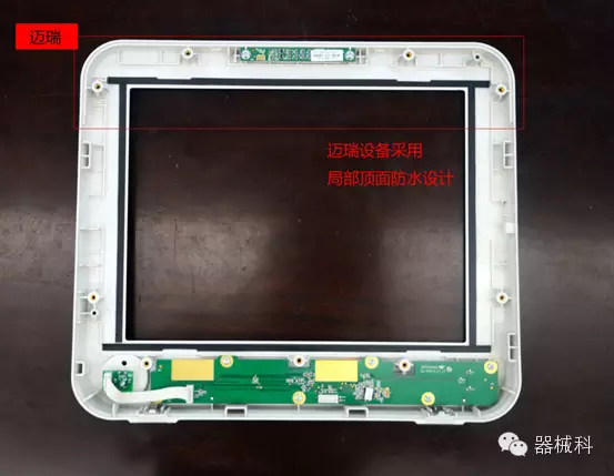 防水是所有電子類產(chǎn)品的一個重要功能。如果防水功能設(shè)計(jì)不好,儀器很容易受潮,從而引起使用不便,嚴(yán)重的將會報廢??坡昂髿ぶg采用硅膠密封線整圈的防水設(shè)計(jì),做工更麻煩,耗材多,但更安全;邁瑞前后殼之間采用硅膠密封線頂部的局部防水設(shè)計(jì),省時省料,但存在安全隱患。