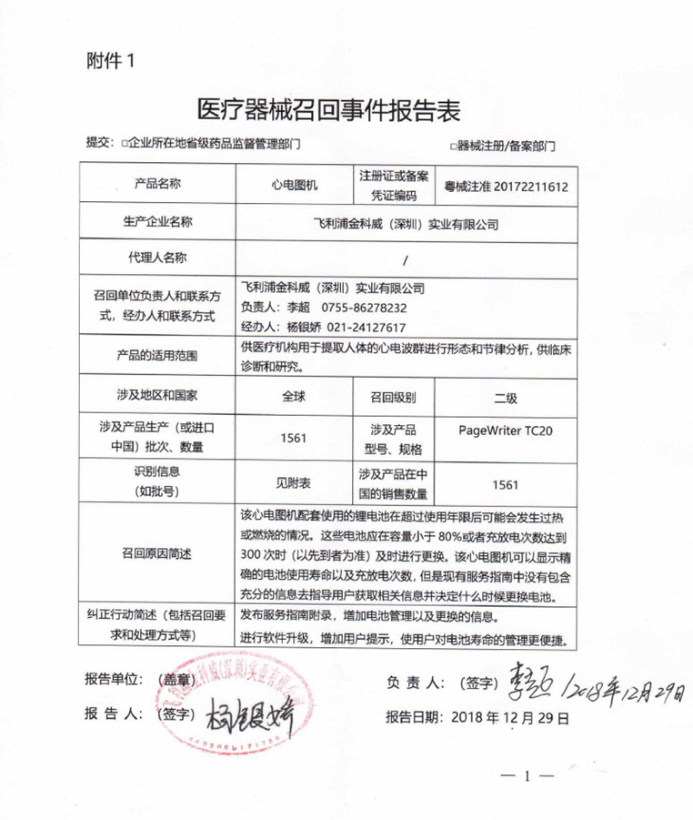 2018年,飛利浦也曾發(fā)布了多起對病人監(jiān)護儀的召回,其中一份召回報告也是二級召回,涉及到2672臺監(jiān)護儀,同樣是通過監(jiān)控內(nèi)部產(chǎn)品投訴發(fā)現(xiàn),存在鋰離子電池超過預期使用壽命后發(fā)熱或燃燒風險。