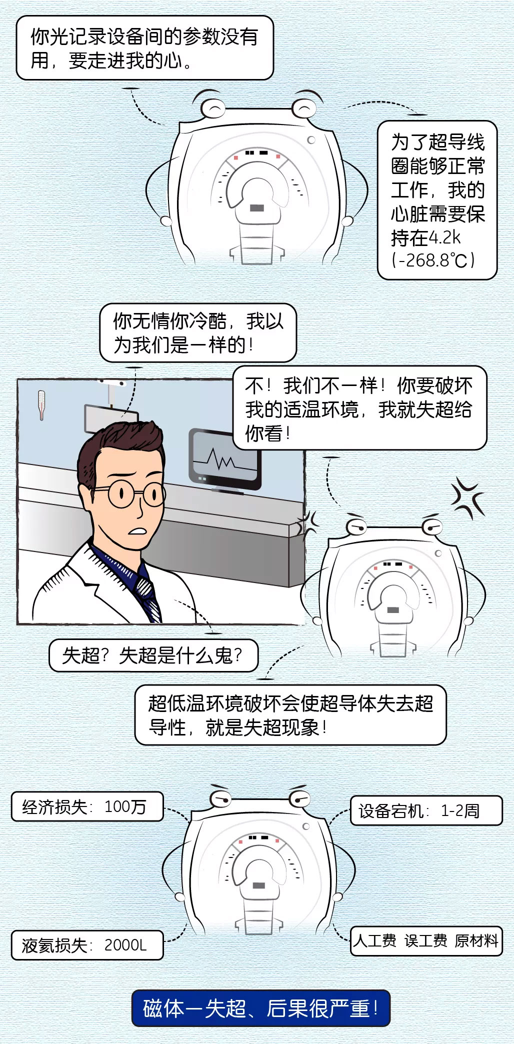 失超對于設(shè)備的運營方而言是近乎毀滅性的災(zāi)難,它意味著:直接經(jīng)濟損失100萬、設(shè)備宕機1-2周、液氦損失2000L,外加上人工費、誤工費和材料費等等。一句話,為免MRI發(fā)生失超,設(shè)備管理員須時刻提防、小心呵護。