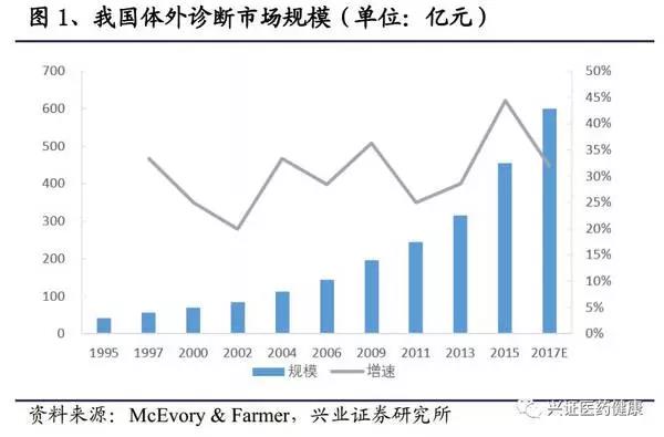 我國體外診斷行業(yè)相較于歐美市場,起步較晚,但發(fā)展快速,2015年,我國IVD市場規(guī)模達(dá)450億,預(yù)計(jì)2017年市場容量有望擴(kuò)增至600億。