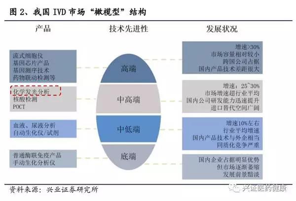 產(chǎn)品結(jié)構(gòu)上,我國體外診斷行業(yè)總體呈現(xiàn)“橄欖型”結(jié)構(gòu):低端市場是前期廣泛使用的檢驗(yàn)技術(shù),發(fā)展空間小,增速緩慢,正在進(jìn)行方法學(xué)上的更新和迭代;中端市場由于近幾年國產(chǎn)研發(fā)能力迅速提升,渠道優(yōu)勢明顯,國內(nèi)產(chǎn)品正在處在高速發(fā)展階段;高端市場由于技術(shù)壁壘高,國內(nèi)外差異大,主要為國外產(chǎn)品,國內(nèi)產(chǎn)品目前在研發(fā)潛伏期,未來將迎來增長。