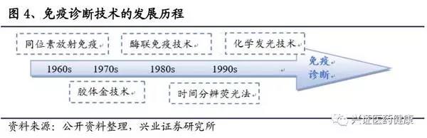 免疫診斷的發(fā)展需要依靠免疫學(xué)技術(shù)的不斷革新,免疫診斷的變革依次經(jīng)歷了放射免疫檢驗(yàn)(RIA)、膠體金快速檢驗(yàn)、酶聯(lián)免疫檢驗(yàn)(ELISA)、時間分辨熒光免疫(TRFIA)的迭代,最終迎來了化學(xué)發(fā)光免疫檢驗(yàn)(CLIA)的時代。