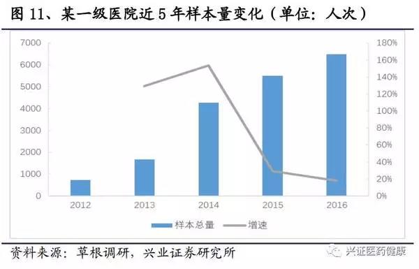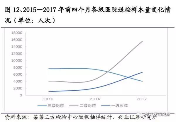 以某第三方檢驗(yàn)中心為例,其發(fā)光樣本主要來自一、二級未開展發(fā)光檢驗(yàn)的醫(yī)院和三級醫(yī)院本身檢驗(yàn)科超承載量的部分。根據(jù)銷售數(shù)據(jù),在送檢的三個級別醫(yī)院中各抽12家穩(wěn)定送檢醫(yī)院可見,總體樣本量呈增長趨勢,其中,一二級醫(yī)院檢驗(yàn)樣本數(shù)量快速增長,在2017年三級醫(yī)院樣本量有所下降,其可能原因,一是醫(yī)院新購發(fā)光儀器可承載更多的樣本檢測,二是由于分級診療的效果顯現(xiàn),三級醫(yī)院的樣本檢驗(yàn)量下調(diào)。
