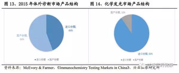 在我國體外診斷市場規(guī)模中,進(jìn)口廠家占據(jù)一半以上的市場份額,國內(nèi)產(chǎn)品呈追趕勢頭。在生化檢驗(yàn)領(lǐng)域,國內(nèi)廠家基本實(shí)現(xiàn)進(jìn)口替代;而免疫、分子等技術(shù)壁壘較高的領(lǐng)域,國內(nèi)廠家前幾年剛剛起步,發(fā)展迅猛?;瘜W(xué)發(fā)光行業(yè)是免疫診斷中技術(shù)最先進(jìn)的部分,目前國內(nèi)市場仍被羅氏、雅培、貝克曼、西門子四巨頭霸占,高端市場尤甚。2011年新產(chǎn)業(yè)推出第一臺全自動化學(xué)發(fā)光儀,國產(chǎn)發(fā)光公司加入市場競爭,目前國產(chǎn)約占10%市場份額,進(jìn)口替代空間巨大。