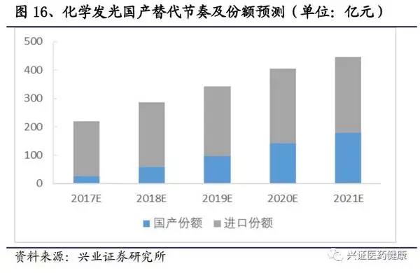 目前,化學(xué)發(fā)光行業(yè)以25%-30%的增速增長,現(xiàn)國內(nèi)企業(yè)已突破技術(shù)壁壘,進(jìn)入銷售放量階段,參考生化替代的節(jié)奏,5年內(nèi)可占有近一半的市場份額。預(yù)計(jì)在2021年,國內(nèi)廠家可總共占有百億以上的市場份額。