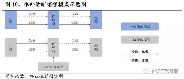 醫(yī)院是產(chǎn)業(yè)鏈上最強(qiáng)勢的一環(huán),國產(chǎn)產(chǎn)品對醫(yī)院的吸引力決定著國產(chǎn)替代進(jìn)程。在銷售模式上,公司多采用直銷和經(jīng)銷相結(jié)合,以經(jīng)銷為主。對于醫(yī)院終端,儀器基本以投放獲得,廠商以搭配銷售試劑的方式獲得收益。體外檢測等醫(yī)療服務(wù)由政府統(tǒng)一定價,應(yīng)用化學(xué)發(fā)光法可相應(yīng)提高收費(fèi)標(biāo)準(zhǔn)(例如:福建省用化學(xué)發(fā)光法可加價80%)。因此,試劑屬于醫(yī)院的“成本項(xiàng)”,醫(yī)院有動力對檢測方法進(jìn)行升級迭代,但卻并沒有動力去特意抬高價格,在相同條件下會考慮試劑性價比,相對市場化。