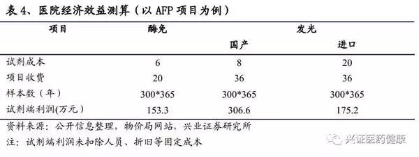 由于儀器是通過投放的形式進(jìn)駐醫(yī)院,從醫(yī)院端只需要計(jì)算試劑成本。以上測算可得出,此醫(yī)院若用發(fā)光替代酶免不僅進(jìn)行了檢驗(yàn)技術(shù)升級,得到優(yōu)化的檢驗(yàn)結(jié)果,在經(jīng)濟(jì)效益上也更優(yōu)。在發(fā)光項(xiàng)目上,國產(chǎn)對比進(jìn)口經(jīng)濟(jì)效益明顯,單個項(xiàng)目可得到百來萬的額外收益。
