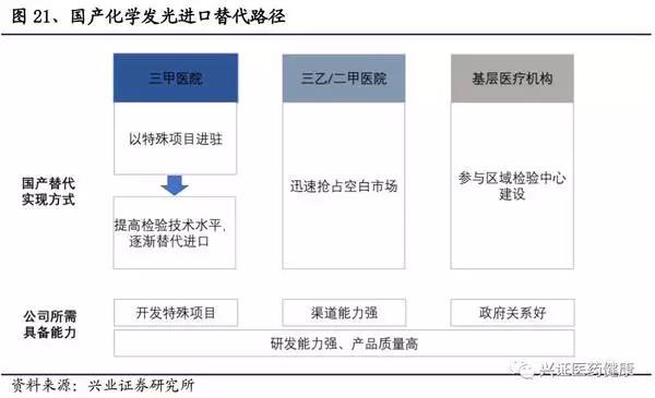 對于三甲醫(yī)院,其技術(shù)偏好較高,從目前的市場反應(yīng)來看,國產(chǎn)發(fā)光儀器和試劑的精確性和穩(wěn)定程度仍不能達(dá)到三甲醫(yī)院的要求。同時三甲醫(yī)院多有聲譽(yù)追求,對進(jìn)口品牌的忠誠度高。在價格上,樣本量大、檢驗(yàn)結(jié)果質(zhì)量要求高、檢驗(yàn)人員成本高致使其相對價格不敏感。而國內(nèi)廠家對于試劑的研發(fā)仍停留在檢測項(xiàng)目的拓展上,基于現(xiàn)狀,大規(guī)模進(jìn)口替代較難實(shí)現(xiàn)。有些特殊項(xiàng)目未涉及,如藥物濃度檢測等,可作為突破口進(jìn)駐高端醫(yī)院,建立品牌形象??傮w來說,短期內(nèi)國內(nèi)廠商可依靠特殊項(xiàng)目檢查可獲得三級醫(yī)院小部分份額,長期來看,想進(jìn)駐高端醫(yī)院并獲得主力項(xiàng)目的份額,須加大研發(fā)投入,做好做精發(fā)光試劑,打破醫(yī)院對于國產(chǎn)山寨的慣性認(rèn)知。
