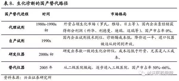 現(xiàn)今,化學(xué)發(fā)光的發(fā)展階段與2000年左右的生化市場相似,回顧生化市場的國產(chǎn)替代進(jìn)程,可有一定的啟示作用。生化的發(fā)展首先從代理國外廠家的試劑開始,逐步自主研發(fā)試劑,此時促使國外廠家對其生化系統(tǒng)進(jìn)行開放。而后逐步研發(fā)出生化儀器,對整個生化診斷進(jìn)行替代。進(jìn)程如下: