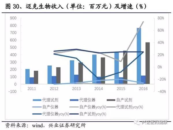 產(chǎn)品線布局全面,放量開啟。邁克早期產(chǎn)品主要是生化試劑,通過代理和自產(chǎn),公司不斷豐富產(chǎn)品線。從產(chǎn)品布局來看,公司與海外龍頭羅氏、雅培類似,采取全覆蓋戰(zhàn)略。隨著行業(yè)的發(fā)展,終端對于產(chǎn)品的需求從單產(chǎn)品轉(zhuǎn)為整體解決方案,產(chǎn)品線延長,保障了未來的增速。短期內(nèi),邁克發(fā)光的快速增長可以有效帶動收入與利潤的增長,其他細(xì)分產(chǎn)品線在2017年以后也即將放量。