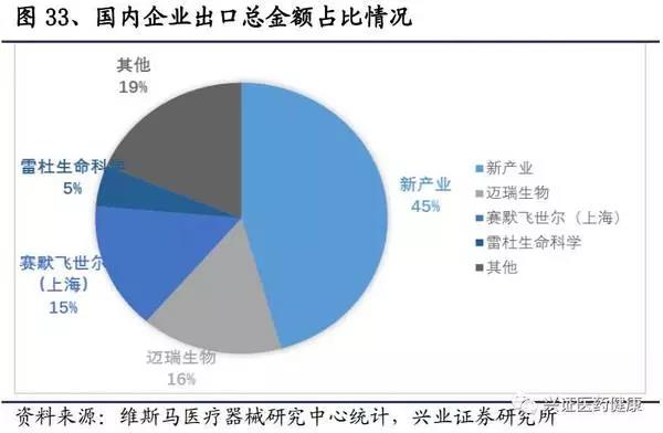 渠道能力強(qiáng),國內(nèi)外銷售情況表現(xiàn)不俗。新產(chǎn)業(yè)采用經(jīng)銷為主,直銷為輔的模式進(jìn)行銷售。在國內(nèi)市場,新產(chǎn)業(yè)終端用戶分布范圍廣,省份分散,覆蓋醫(yī)院3000多家。其中,二級醫(yī)院有1千多家,三級醫(yī)院近1千家,一級醫(yī)院較少。今后,一級醫(yī)院市場將被充分開發(fā),將通過自購或者區(qū)域檢驗(yàn)中心的方式,將免疫檢測技術(shù)更新至化學(xué)發(fā)光法,市場空間巨大。在出口方面,儀器出口收入占到總收入近一半,試劑出口收入占到10%左右。2016年出口總額為國內(nèi)第一,占到總金額的45.6%。