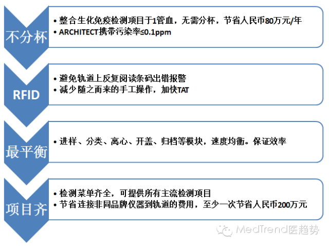 縱觀IVD國際品牌的發(fā)展歷程,都是從低速生化朝高速生化發(fā)展,由單機(jī)朝向集成化、自動化、流水線的方向發(fā)展。由于中國病人的過度集中于大型三級醫(yī)院,年收入超過10億的醫(yī)院每天樣本量超過1000個,高速儀器是高端醫(yī)院的剛需,因此研發(fā)高速儀器的能力也是未來進(jìn)入大型公立醫(yī)院的前提要求,流水線、生化免疫聯(lián)機(jī)是大勢所趨。