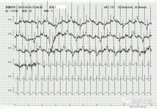 3、關(guān)于抗干擾能力,對于只有兩個(gè)電極沒有地線的情況下,對這個(gè)機(jī)器的要求真的不能太高。基線干擾和不穩(wěn)定是經(jīng)常的,所以需要測試人配合安靜勿動。測試1描測的心電圖除了只有一個(gè)導(dǎo)聯(lián)的限制之外,基本可以滿足各項(xiàng)心電圖數(shù)據(jù)的測量。測試2和3都是處于深度鎮(zhèn)靜氣管插管的小兒,出現(xiàn)兩個(gè)問題:1.小兒腹軟且腹部動度較大導(dǎo)致呼吸波干擾明顯,所以建議把左下腹電極片貼到左髂部或左股部外側(cè);2.基線干擾更加明顯,這時(shí)本人手握患兒左下肢后基線干擾消失,對心電記錄波形沒有產(chǎn)生明顯影響。
